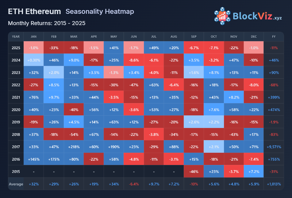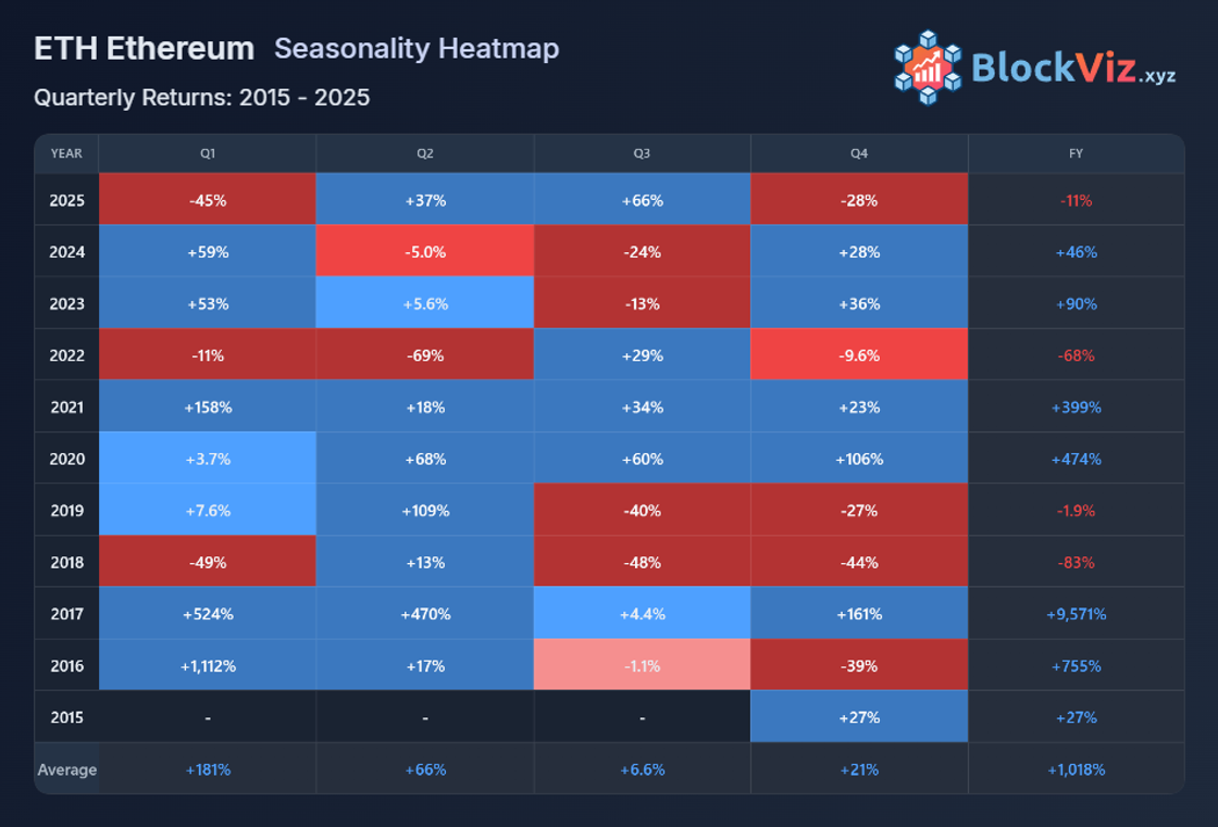 Using long-term BTC and ETH seasonality heatmaps, both monthly and quarterly, a clearer picture emerges: crypto does exhibit seasonal tendencies, but those tendencies are highly conditional on market regime and cycle position.