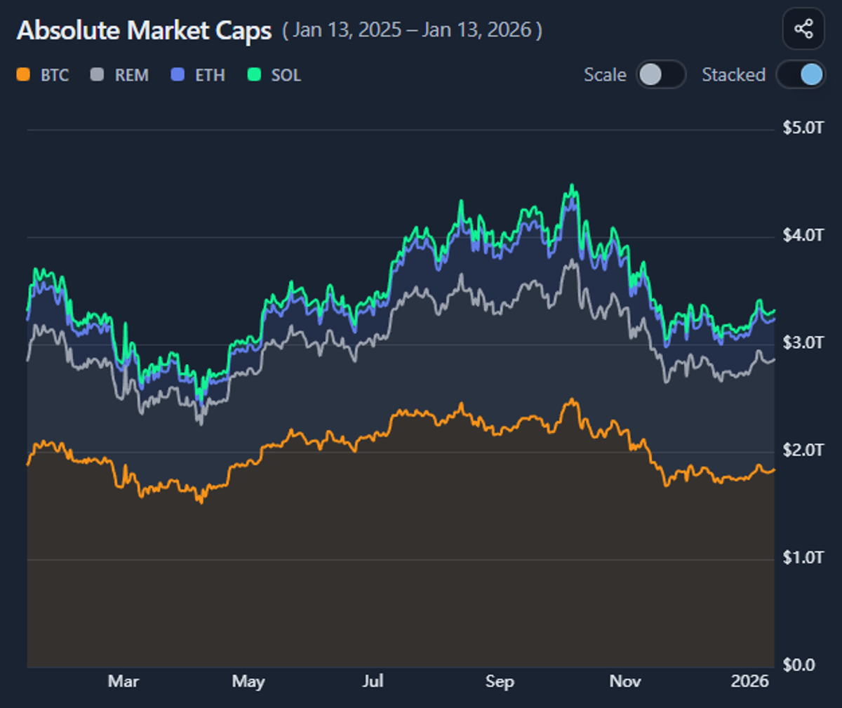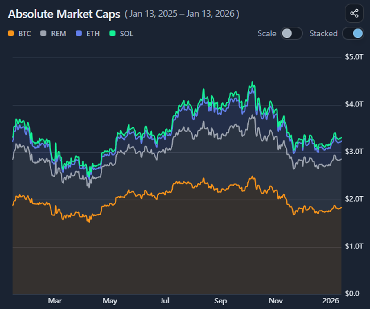 When comparing market cap development across many assets, showing every component individually can quickly overwhelm the chart.