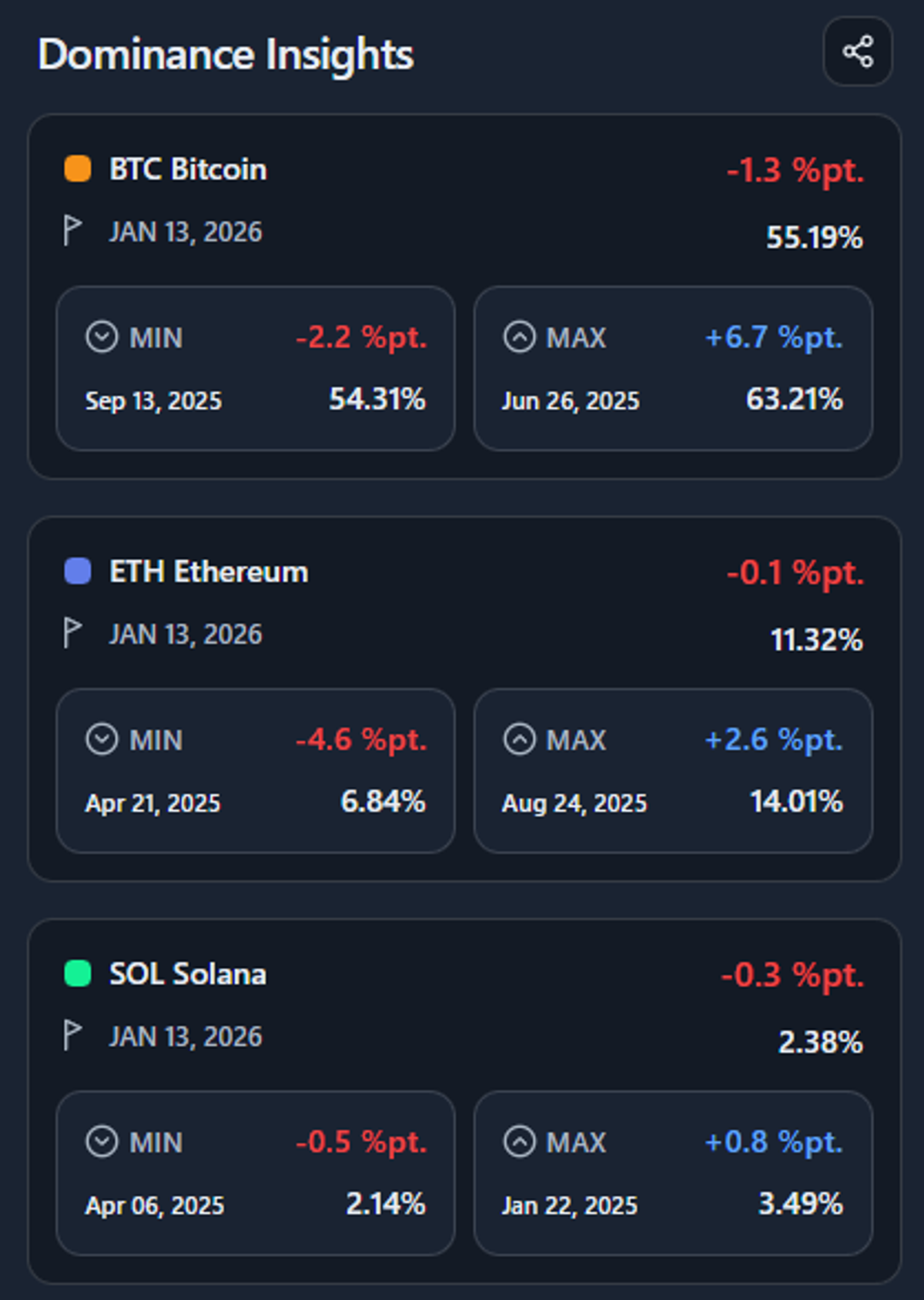 Dominance trends often move slower than price, making them useful for regime-level analysis.