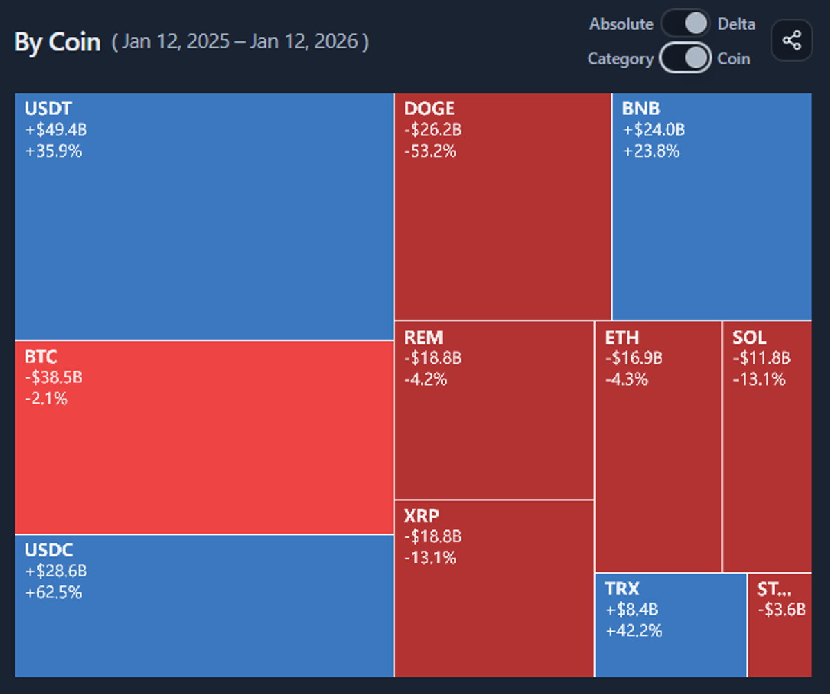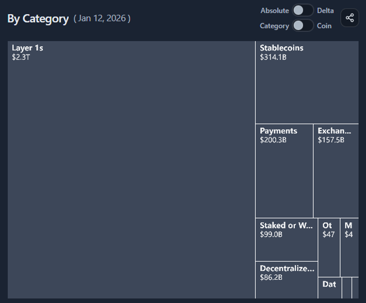 - tiles represent aggregated sectors (e.g. Layer 1s, Memecoins)