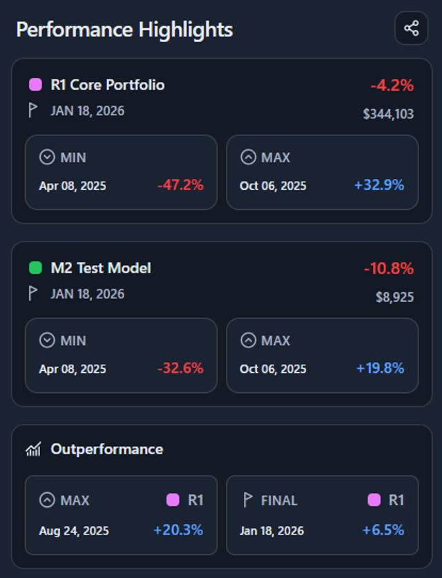 - Model portfolios defined by weights (e.g. 80% BTC / 20% ETH)