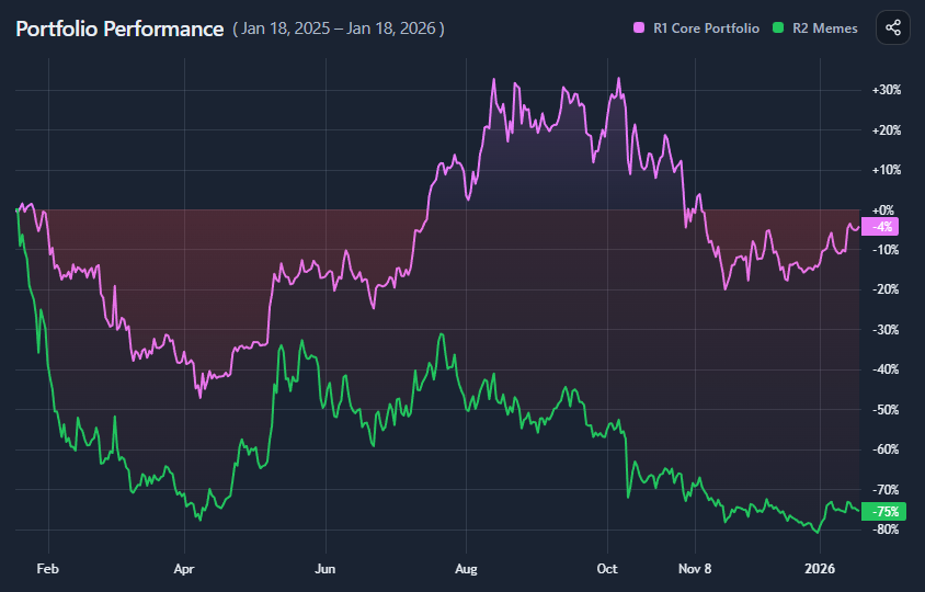 Each portfolio is rebased to 100 at the selected start date. From that point on, the chart shows relative returns, not absolute value.