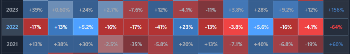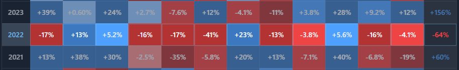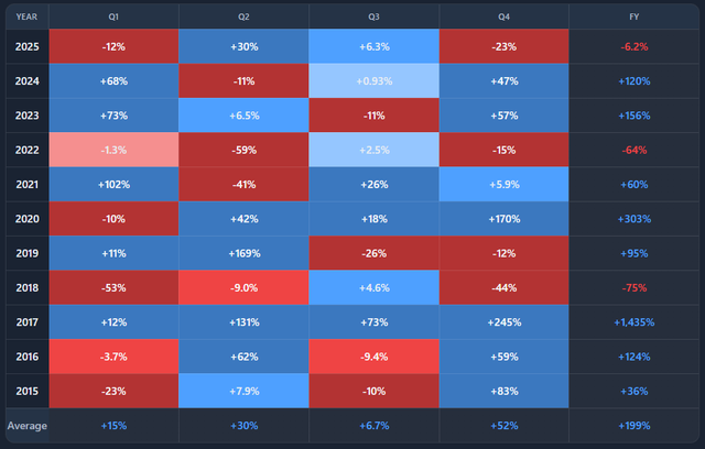 You are looking at a multi-year heatmap of returns, grouped by month or quarter.