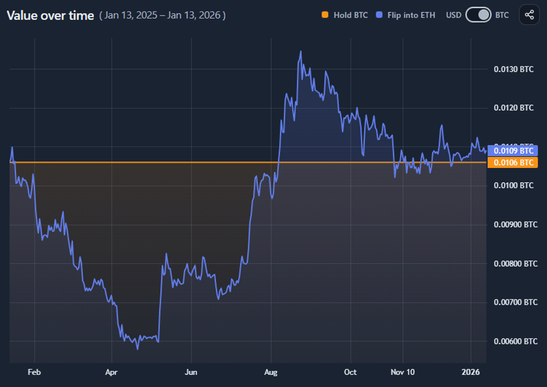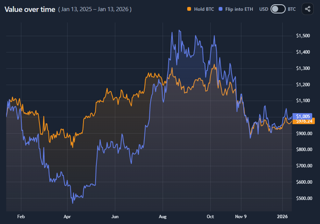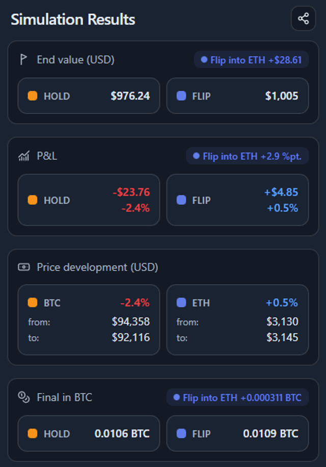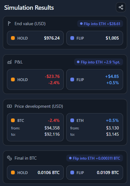 Coin Flip makes this explicit by simulating a real position and comparing outcomes both in fiat and in crypto terms.