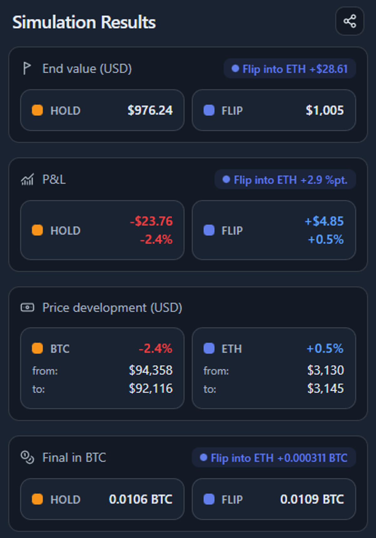 - A flip can outperform in USD but still result in fewer BTC