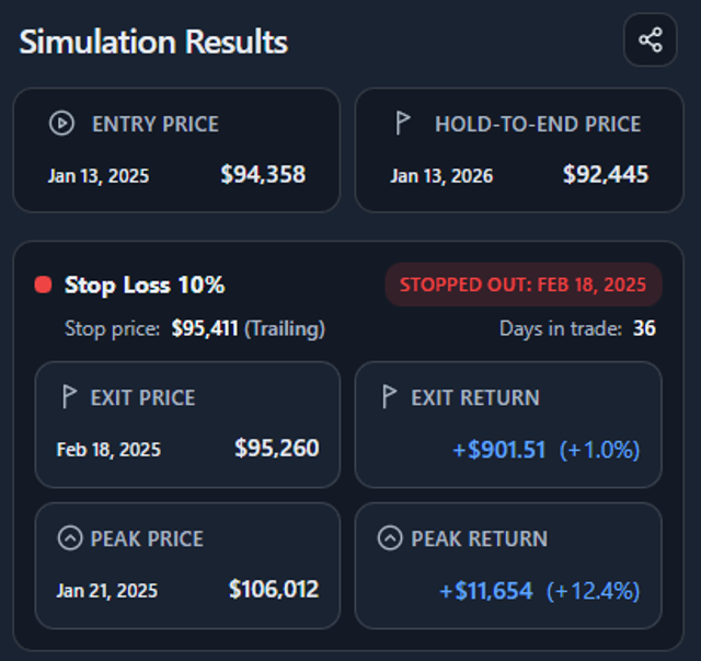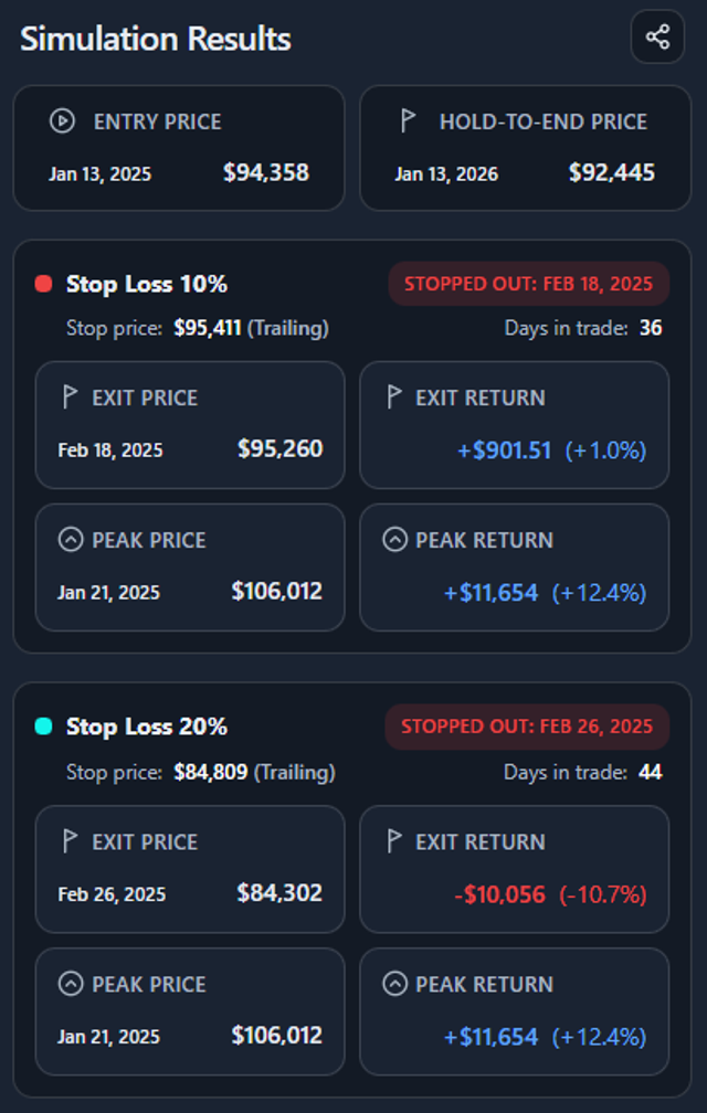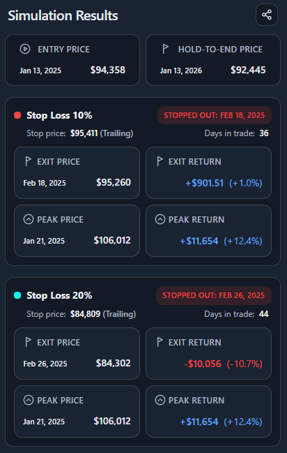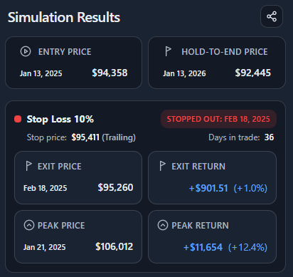 This simulator answers that question explicitly and visually, using real price paths instead of intuition. It shows if, when, and at what price a fixed or trailing stop would have exited your position.