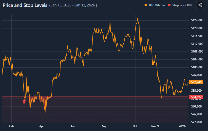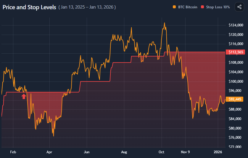 The chart overlays stop logic directly on price: