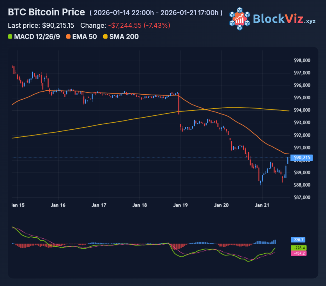 The “Davos twist” felt like a quick risk-off pulse. When macro headlines hit, BTC usually moves like high beta tech first, narrative second. The dump to 88K looked more like positioning getting flushed than some new crypto-specific problem.