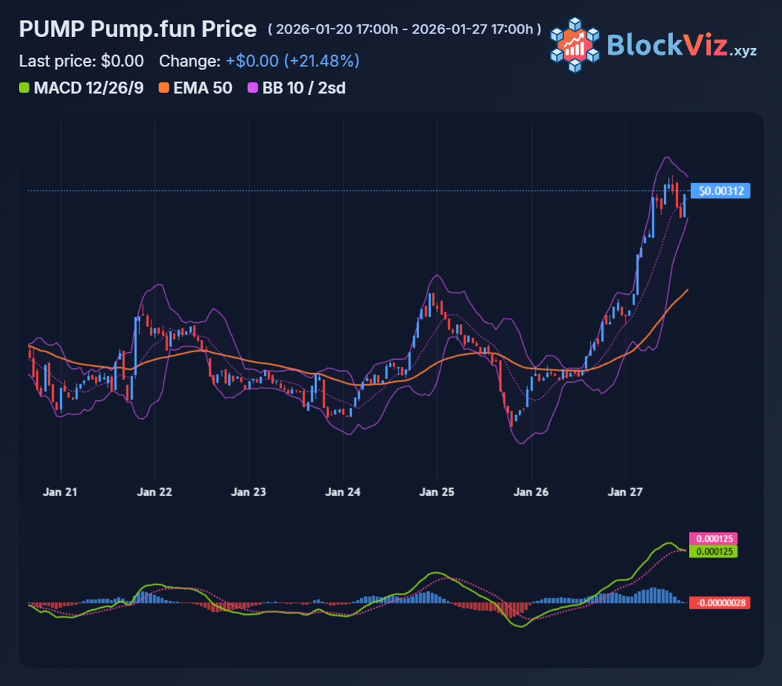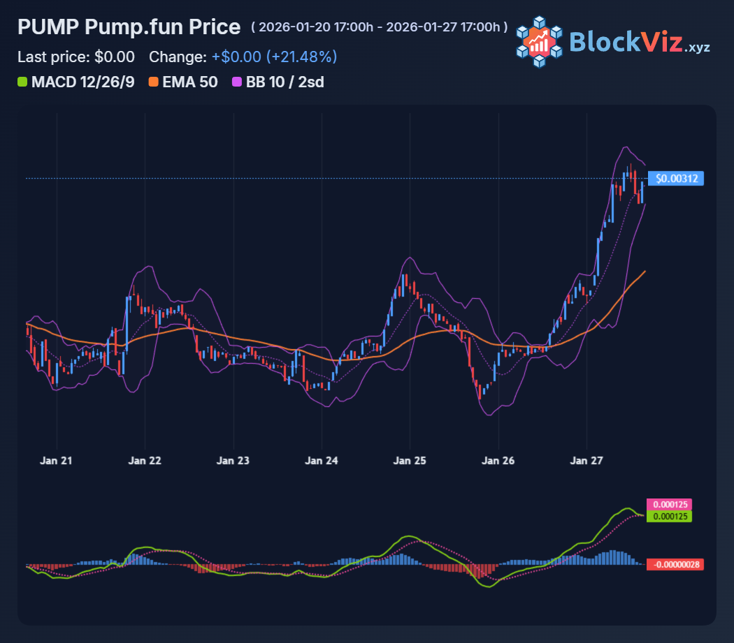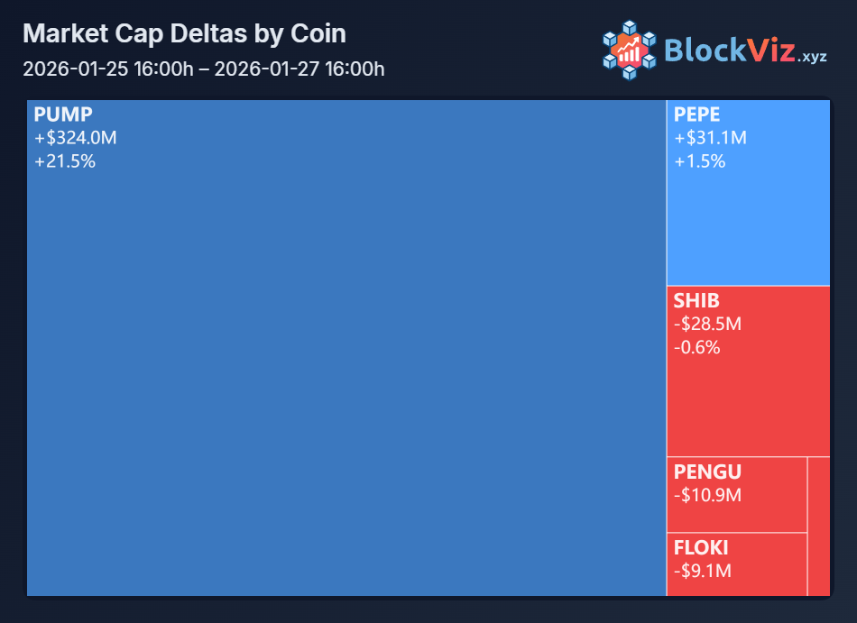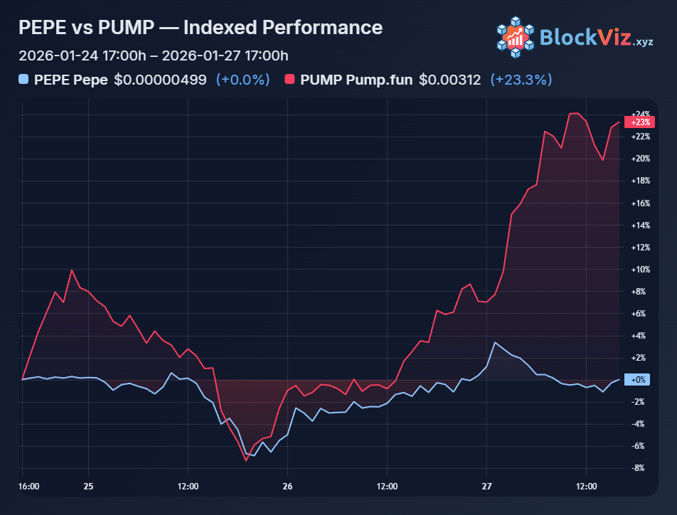 PUMP's ripping double digits today on strong volume, building on 50%+ 30-day gains while BTC sits tight. PumpFun's 2026 fee tweaks, shifting from rug spam to actual trading liquidity, are finally resonating. Memes outperforming majors like this usually signals broader alt rotation coming in weeks.