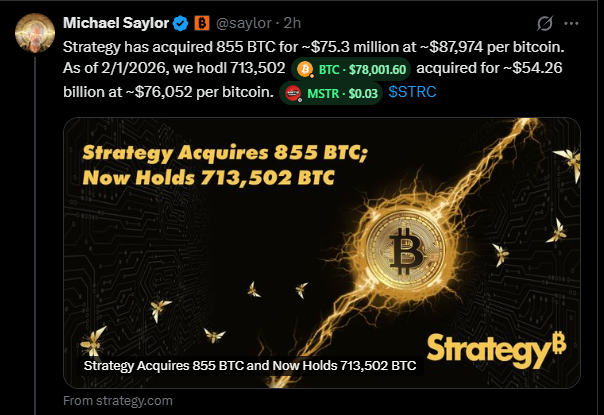 The company holds over 700k BTC at an average cost near the mid 70k region, putting total fiat invested north of 50 billion dollars. As BTC traded briefly below that level on February 2, the treasury slipped underwater by low single digit percentages before recovering slightly with the intraday bounce.