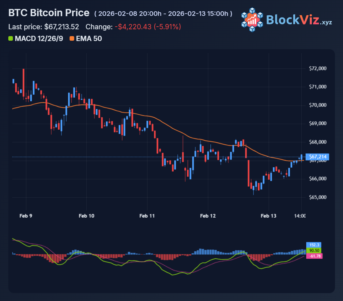 Bears control below $70K. Weekly close under $65K opens $60K zone, aligning with prior swing lows and 50% retracement from November highs. Sub-$60K accelerates toward $55K, where 200-week moving average defends. Macro pressures from higher-for-longer rates and rising real yields squeeze risk assets.