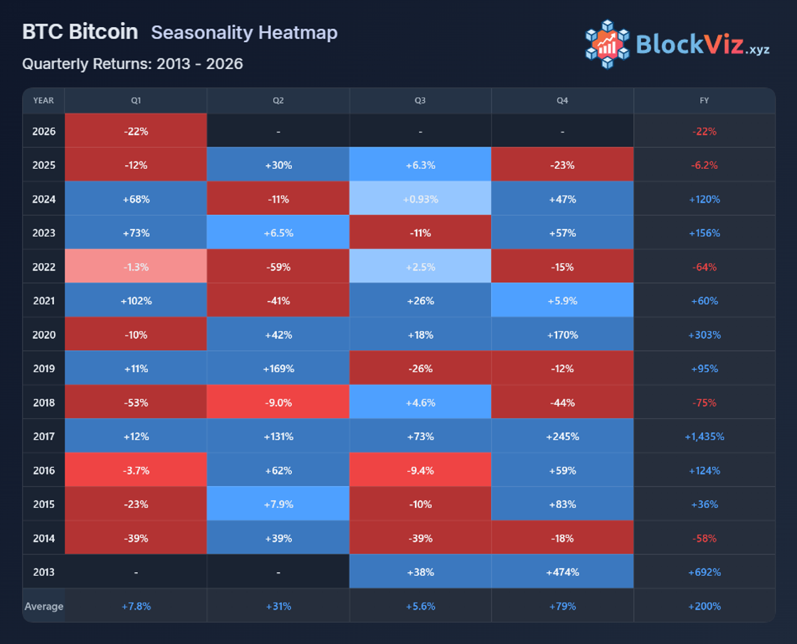 Seasonality adds context. Q1 ranks among Bitcoin’s roughest quarters, but weak starts often seed sharp Q2 rebounds. Back-to-back January-February losses would be a first, yet history shows no year defined by early pain alone.