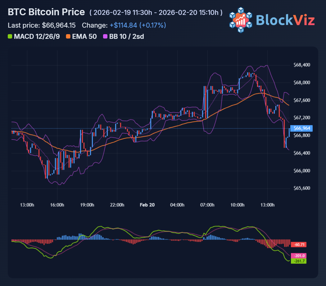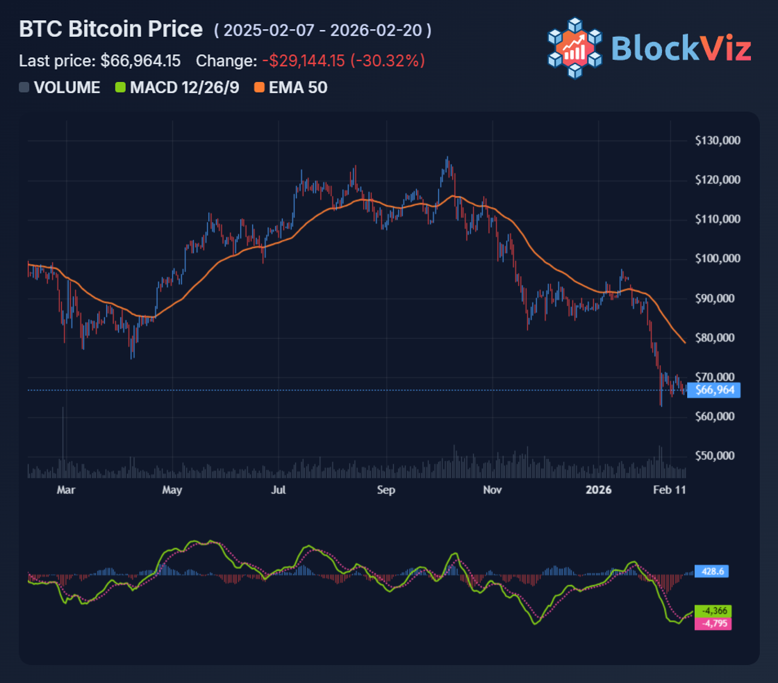 Bitcoin trades around $67k today, up ~1% from yesterday after probing $62,000 lows earlier this month. This places $BTC still 30% off its 2026 peak near $96,500, a correction tied to paused Fed rate cuts and a firm dollar index at 108. Trading volume remains subdued at $45 billion daily, down 40% from January peaks.