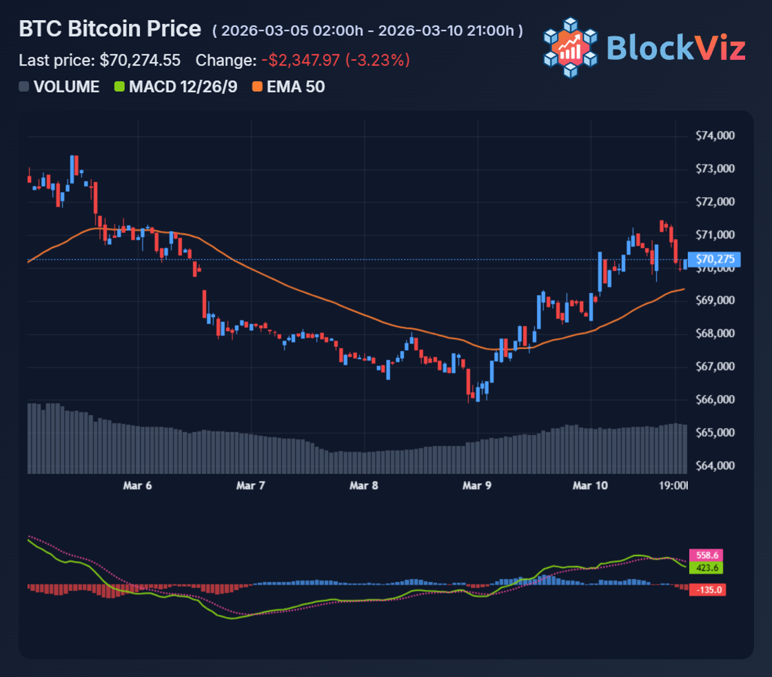 Current chart setup supports potential upside. BTC faces resistance at $70K-$71K, with firm support at $68K. RSI sits neutral at 55, leaving room for momentum without immediate overbought signals. Volume needs to pick up for conviction, but on-chain data shows steady ETF inflows bolstering the base.
